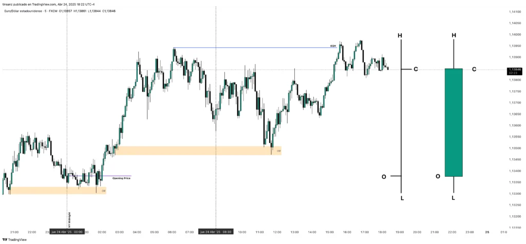 - Low (Retroceso) – Donde el precio busca liquidez por debajo del Open.